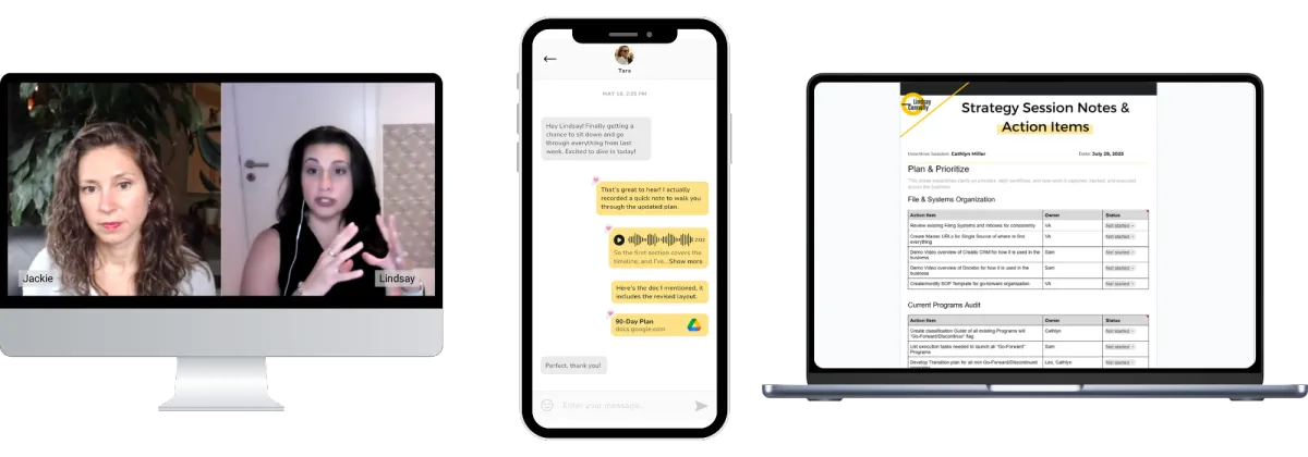 This is a 90-minute deep-dive designed to help you get unstuck and move forward with clarity and confidence. Together, we’ll identify what’s holding your business back, map out your next 90 days, and create a simple, actionable plan that aligns your operations with your big-picture goals.